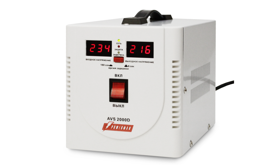 релейный стабилизатор напряжения напольное размещение полная мощность 2000 В·А входное напряжение 140-260 В выходное напряжение 202-238 В класс защиты IP20 защита от короткого замыкания, от перегрева, от повышенного напряжения, от помех естественное охлаждение точность стабилизации 8% штепсельная вилка уровень шума NoiseLevel дБ