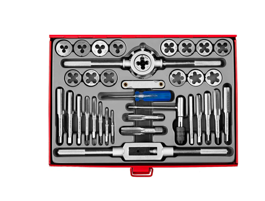 Метчики из инструментальной стали 9ХС по ГОСТ 3266-81. Плашки из инструментальной стали 9ХС по ГОСТ 9740-71. Плашкодержатель со стопорными винтами для фиксации и центровки плашки. Метчикодержатель с регулируемым винтовым механизмом. Т-образный метчикодержатель с фиксированным зажимным патроном.