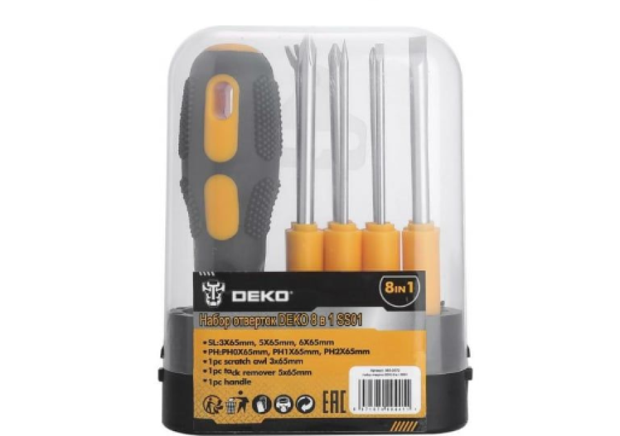 Количество предметов 8 предметов Описание Набор отверток DEKO 8 в 1 SS01 включает в себя: 3 шт. Slotted:3х65,5х65,6х65 мм., 3 шт Phillips:PH0х65,PH1х65,PH2х65 мм., чертилка 3х65 мм., гвоздодер для гвоздей и кнопок 5х65 мм., рукоятка. Набор отверток в комплекте